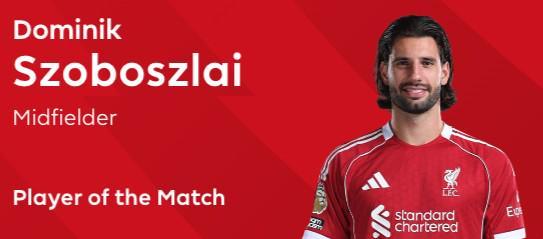 英超第3轮,利物浦主场1-0击败阿森纳,此役打入全场唯一进球的索博斯洛伊当选英超官方全场最佳球员。
